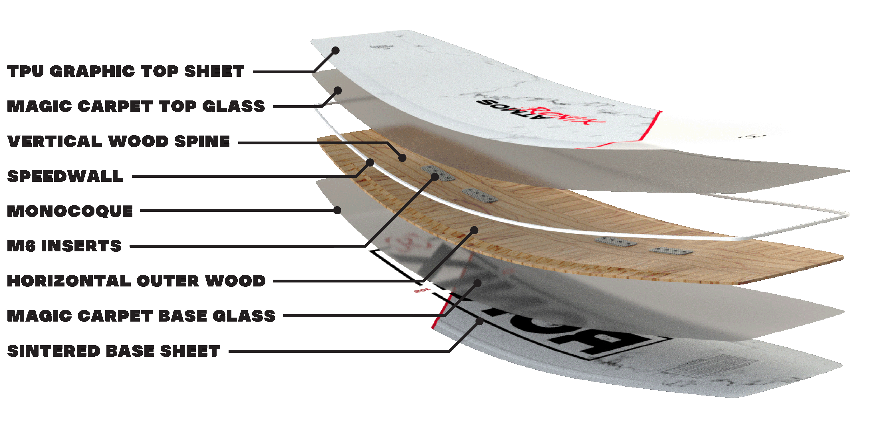 We took general design aspects of our popular Top Notch Pro series and added a first in cable boards–a spine. Typically, we will put vertical wood in specific pockets for strength, then have horizontal wood in other areas for added feel and more exaggerated presses. We developed a new spine where the strength runs the way a stringer does on a surfer, from tip to tail, then leaves the majority of the outer surface area with a much softer horizontal wood. With the Atmos you have a pivot point running the length of the board, not just in certain pockets, allowing most of the board to comply from side to side. We are proud to present a construction that will melt on rails in a way you have never experienced all without scarifying the durability to take on anything in its path. Bigger ollies, easier transfers, and our most conforming side to side flex–the Atmos.